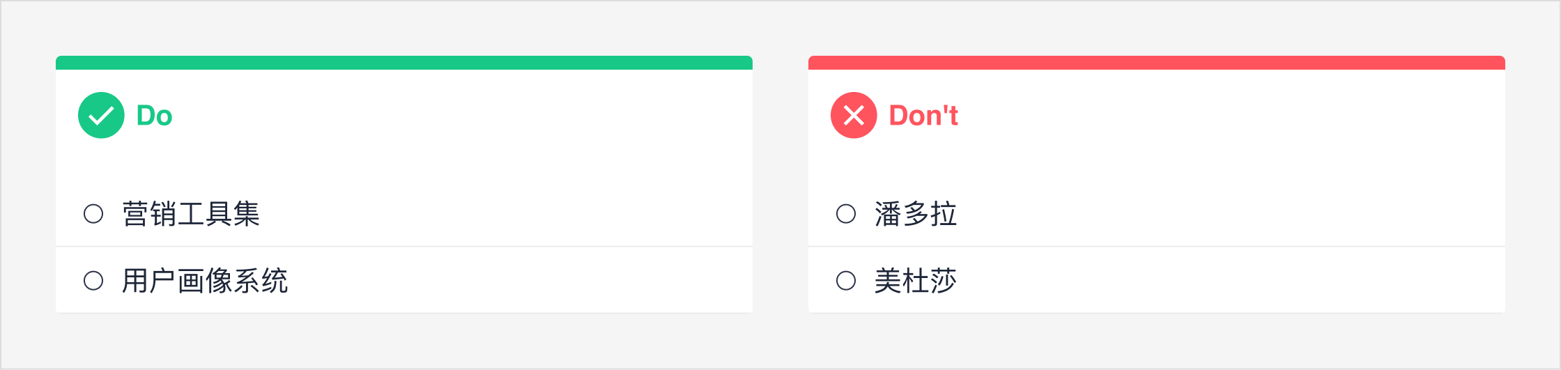 - 专业通用:对标行业,通用名词可作为用户最容易理解的语言,避免有悖于行业自造用语。